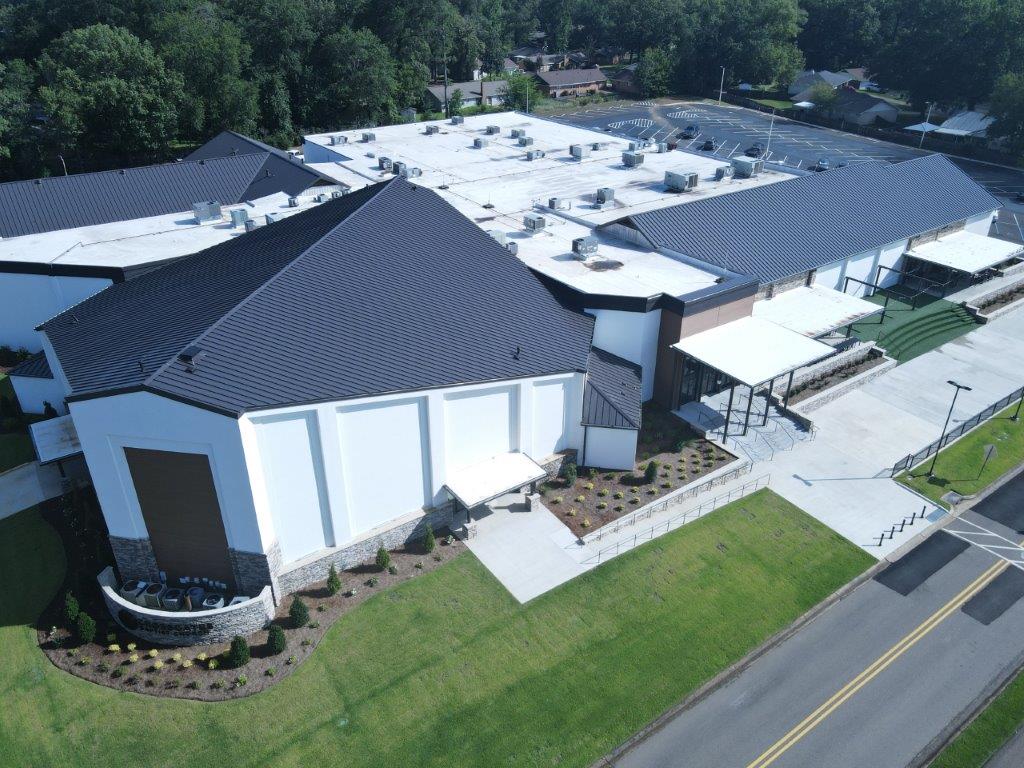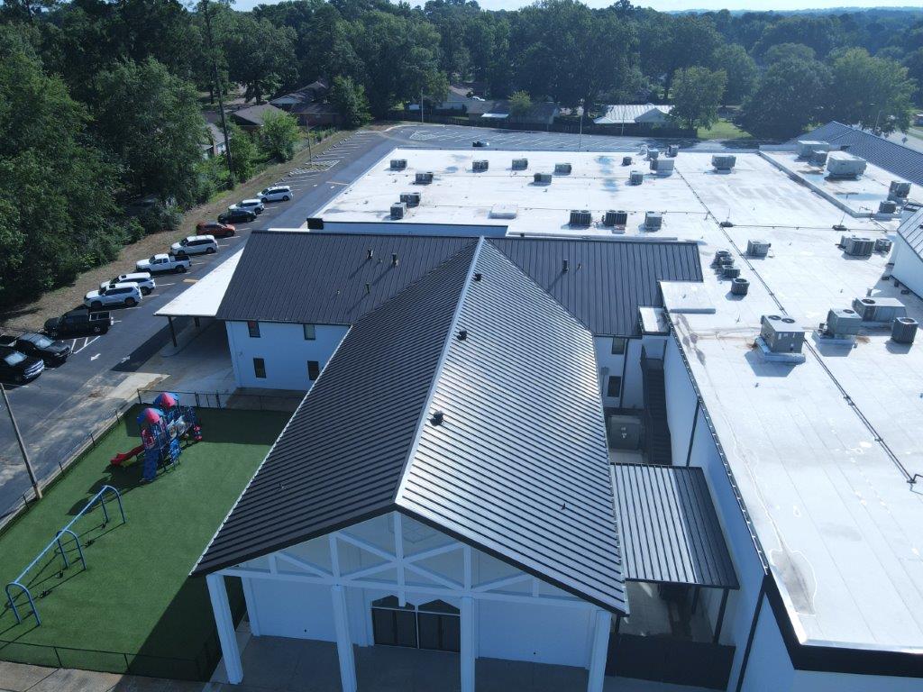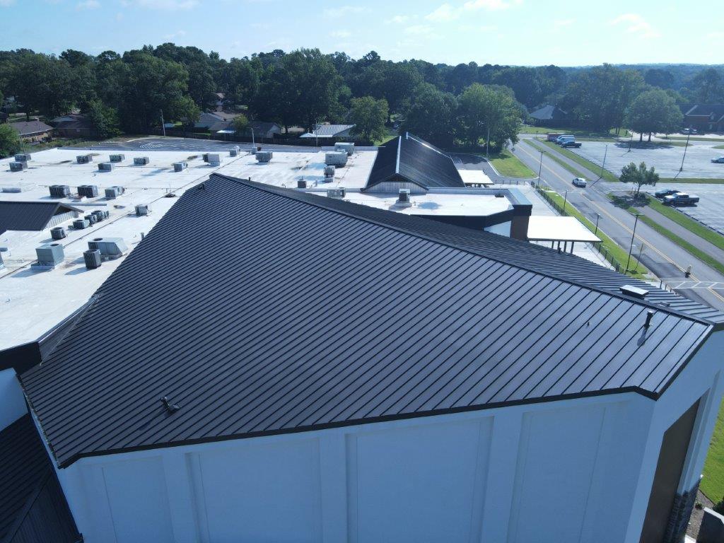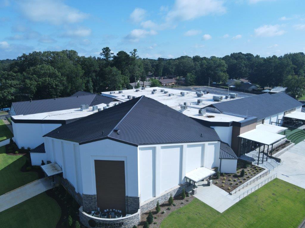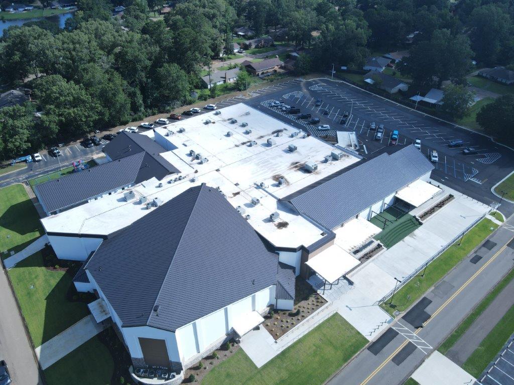 Independent Roofing was selected to restore and upgrade the roofing system at Crossgates Baptist Church in Brandon, MS. The project included both a tear-off and re-roof of the sanctuary and newly constructed canopy areas. The team replaced the aging shingle roof with a durable standing seam metal system and installed new TPO roofing over the canopies.