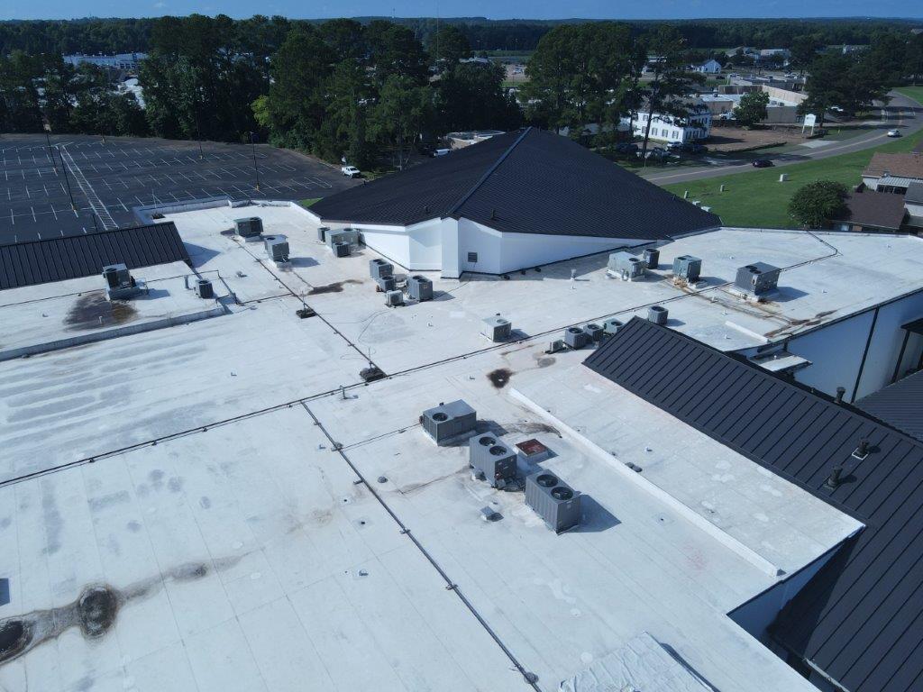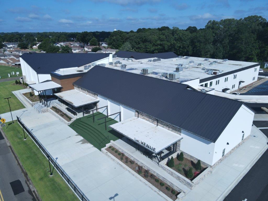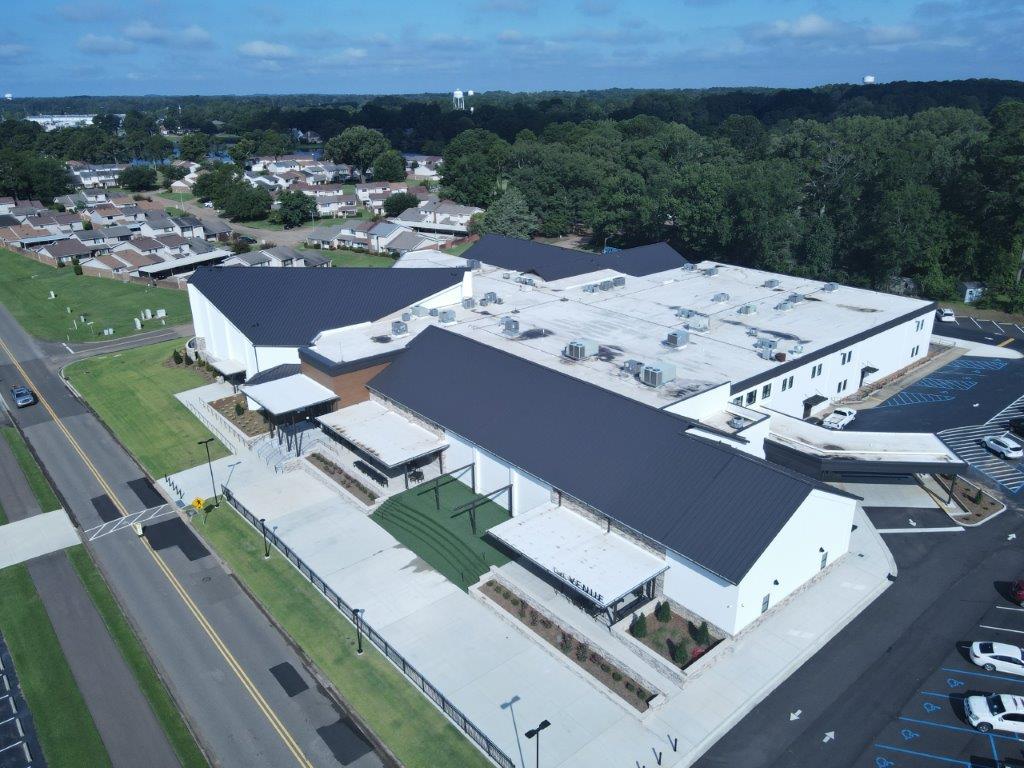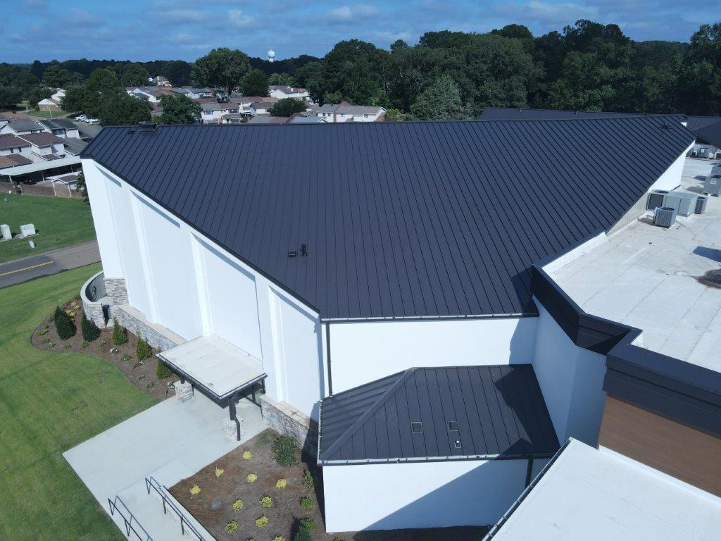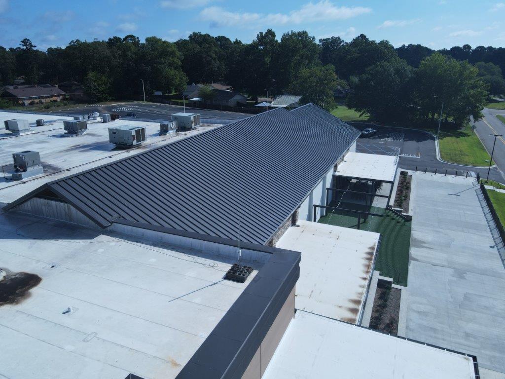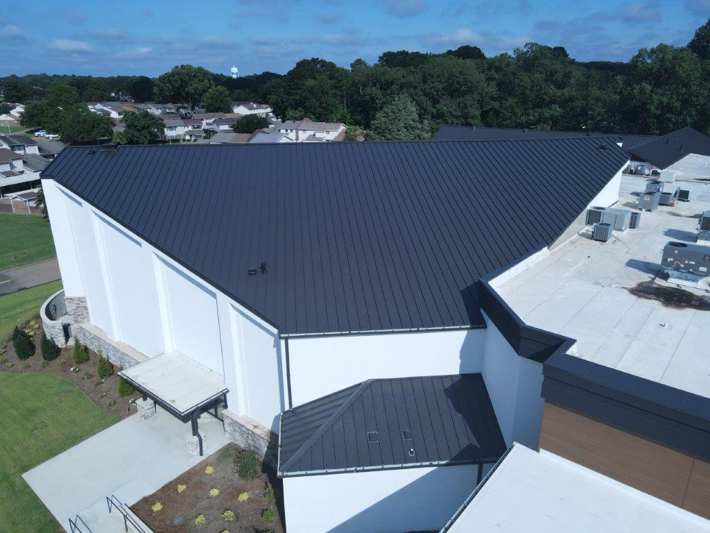 Independent Roofing was selected to restore and upgrade the roofing system at Crossgates Baptist Church in Brandon, MS. The project included both a tear-off and re-roof of the sanctuary and newly constructed canopy areas. The team replaced the aging shingle roof with a durable standing seam metal system and installed new TPO roofing over the canopies.