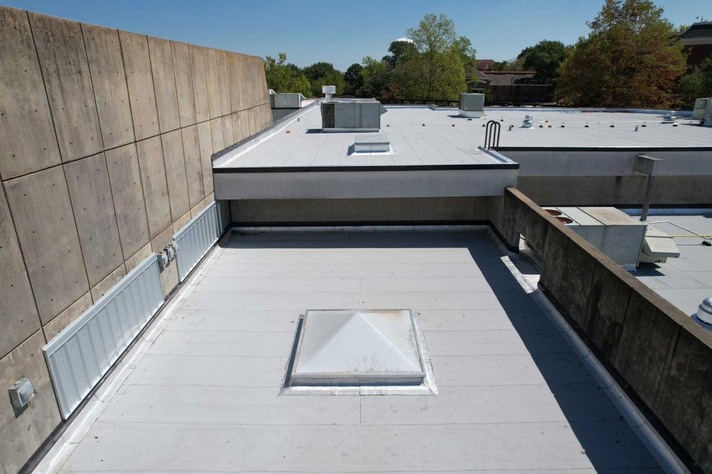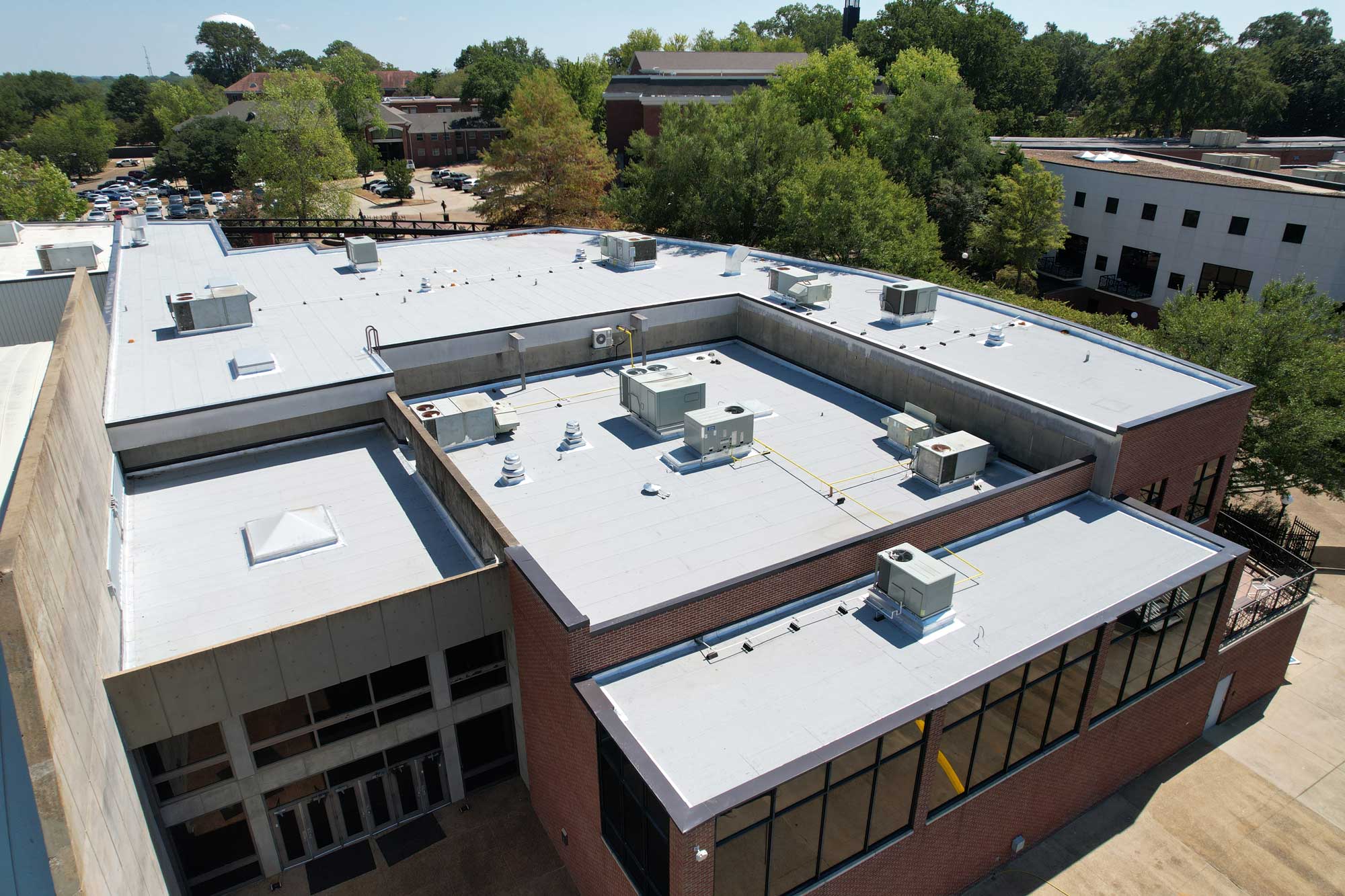 The shape of the building and its drainage needs demanded a creative taper insulation strategy. The team also had a narrow window to complete the work during summer break, avoiding interference with the academic calendar or campus activities.